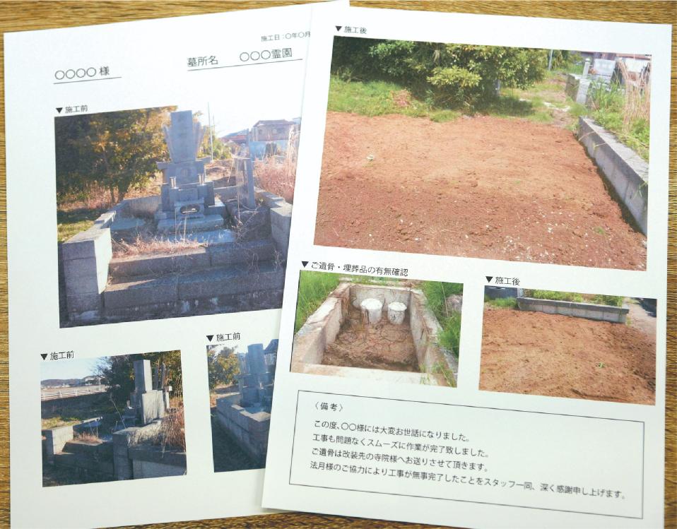 お墓じまい施工前と後のお写真を撮影し、作業完了報告書と共にお客様に後日郵送いたします。お墓じまいの際のお立合いができない方もご安心ください。​